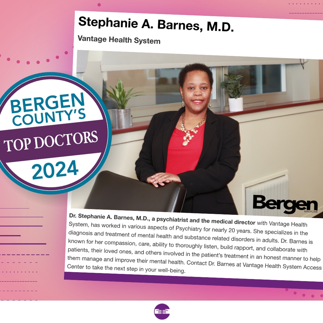 We are delighted to announce that Dr. Stephanie A. Barnes, M.D., psychiatrist and medical director at Vantage Health System, has once again been recognized as one of the Top Docs in Bergen’s Magazine for 2024. With nearly 20 years of experience, Dr. Barnes has been an invaluable asset to our team, embodying dedication and excellence in patient care.